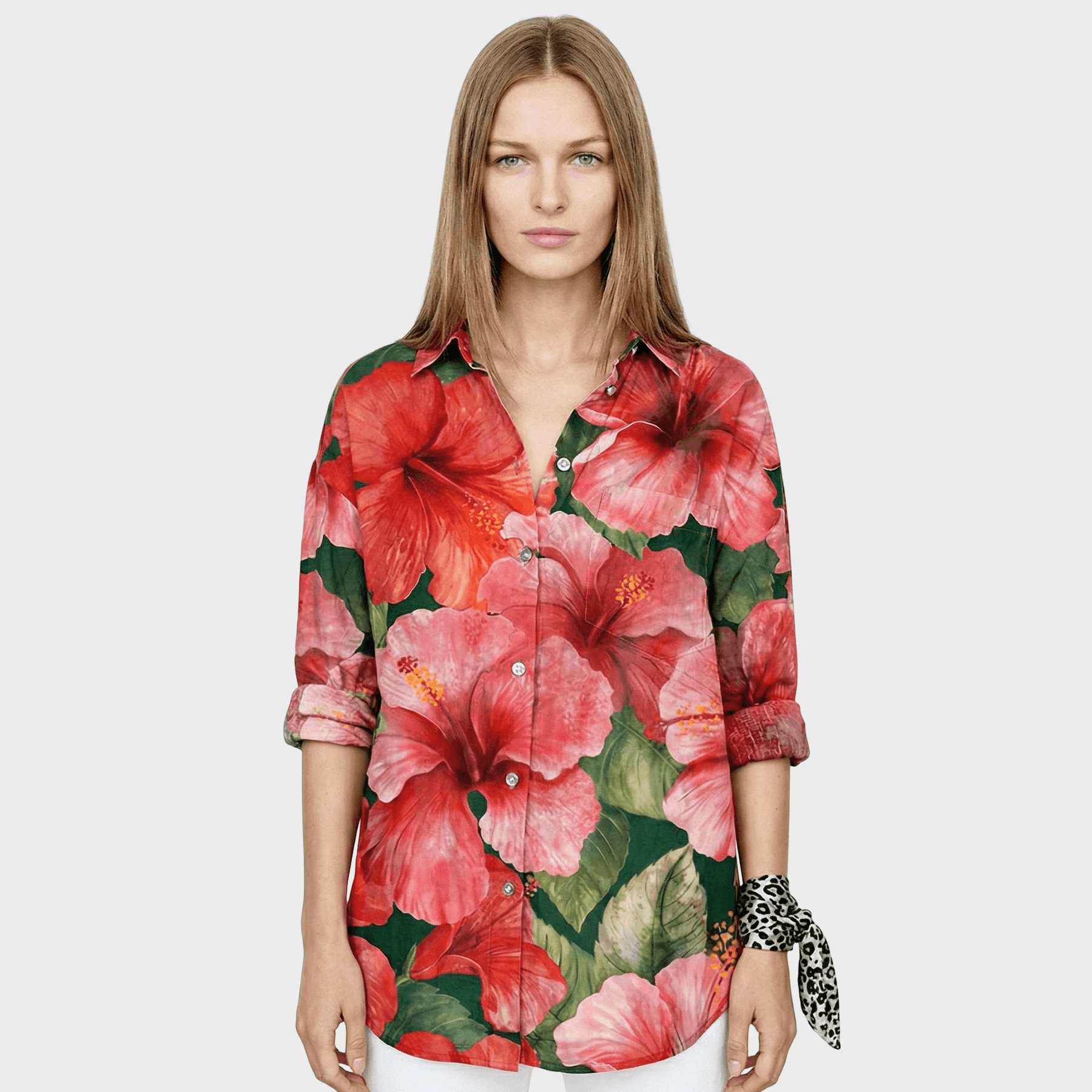 Ilgomis rankovėmis marškiniai su ryškiais gėlių raštais raudonos ir rožinės spalvos atspalviuose suteikia gyvybingumo ir vasariškos nuotaikos kiekvienam įvaizdžiui. Klasikinis apykaklė ir mygtukų užsegimas daro ją universalų pasirinkimą, puikiai tinkantį tiek kasdienėms, tiek elegantiškesnėms progoms.