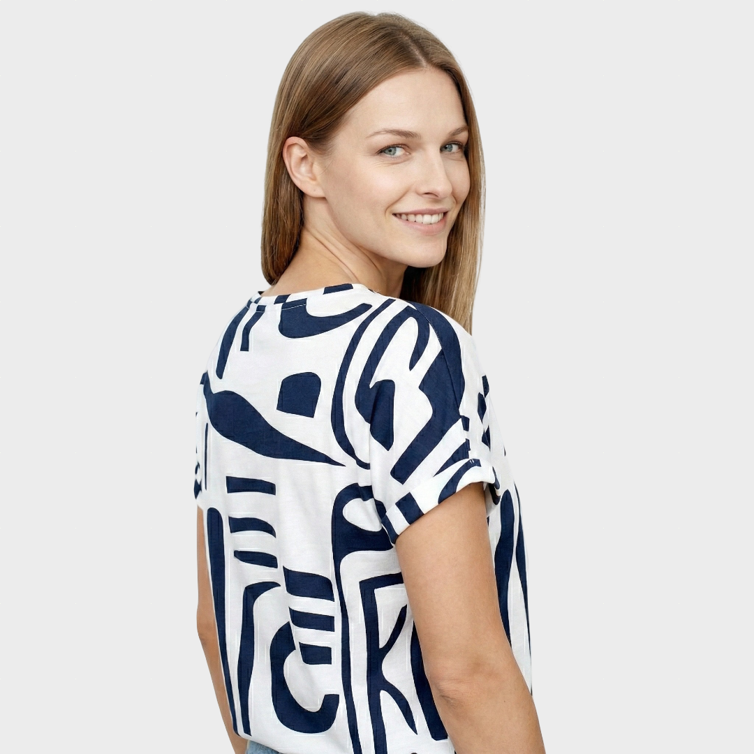 Trumpomis rankovėmis bliuska balta spalva su mėlynomis abstrakčiomis geometrinėmis formomis siūlo modernų ir gaivų stilių. Jos laisvas pritaikymas daro ją idealia kasdieniams pasirodymams, o ją galima dėvėti tiek su džinsais, tiek su sijonais, kad atrodytų elegantiškiau.
